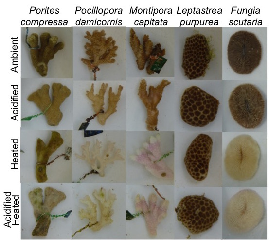 Previous work has shown ocean warming and acidification reduces coral growth and increases coral bleaching (through the loss of algal symbionts); however, responses are not uniform within and between coral species. This suggests some individuals may not be affected by end-of-century climate change scenarios. To gain a better understanding of the future of coral reefs in Hawaiʻi, I conducted a series of laboratory experiments to determine the relative susceptibility of five abundant species including the endemic finger coral (Porites compressa), lace coral (Pocillopora damicornis), rice coral (Montipora capitata), crust coral (Leptastrea purpurea) and mushroom coral (Fungia scutaria) to future climate change conditions. I did this by exposing corals to warming temperatures of 2°C or more, as well as ocean acidification by decreasing the pH of the water. I exposed corals to these factors separately and together for an eight-week period.