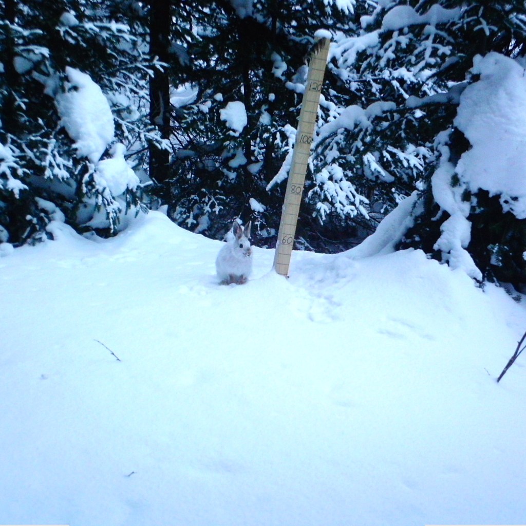 Let me frame this story within the context of competition for food. Many of the mid-sized carnivores in the northeastern United States rely on snowshoe hares during the winter months. Since hares are snow-adapted species, with higher survival in deep and powdery snow that persists the length of time their coat-color remains white, then a changing climate with shorter winters with shallow and crusty snow spells trouble. Recent research from SE CSC Fellow Marketa Zimova, indicates that hares have lower survival when their coat-color is mismatched against the background conditions (e.g., white coat-color without snow). Also, the hardness of the snow surface has been linked with higher predation rates for lynx and coyotes. Given the predicted increase in snow crusting due to warmer winters, these conditions may further compromise hare populations. But there may be hope for hares and other boreal forest species in the northeastern US. Montane forest contains extensive spruce-fir habitat – hares preferred cover – and deep snow that is predicted to persist into the future.