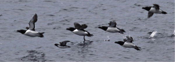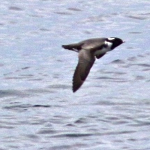 Grabbing one of my co-workers, a scope, binoculars, and camera, we sprinted across the boulders and finally reached the spot John had specified. Scanning the rafts of Razorbills, I picked out the small alcid, and indeed it was an Ancient Murrelet! It was floating close to shore, associating with a small flock of Razorbills, which seemed to at least be tolerating this wee stranger. When the group took flight it was close in tow while they whirled around, making a few passes before the murrelet split off and landed on the open water about a mile off the island. Unfortunately, searching by both land and by sea we never turned up the bird again that day.
