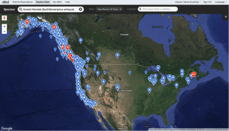 Ancient Murrelets have had quite a history of inland wandering. If you check out an eBird Map of Ancient Murrelet sightings you will see exactly that. A couple of short publications during the 1960s tried to explain this “inland wandering phenomena” using correlations between poor weather conditions prior to when these rare inland sightings of Ancient Murrelets occurred (1 &2). They also stated that inland sightings were most likely during the fall when birds nesting high in the Pacific Northwest made their migration southeast thus, giving the birds the potential to be blown off course and further inland.