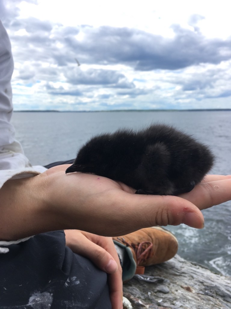Aside from practicing on baby chickens at Project Puffin orientation earlier in the summer, this was my first time working hands-on with birds and learning these scientific techniques. Thankfully, most of the chicks were cooperative (and adorable) and I got the hang of things pretty quickly. Additionally, this was my first time camping for an extended period of time. It was an easy introduction though, as our camp was very comfortable, and I enjoyed aspects of island life like swimming, rowing, and stargazing. All in all, I had a great first experience doing field work, and look forward to similar work in the future. I saw lots of birds I had never seen before, including laughing gulls, roseate terns, sandpipers, a northern gannet, and one lone, lost looking merganser!