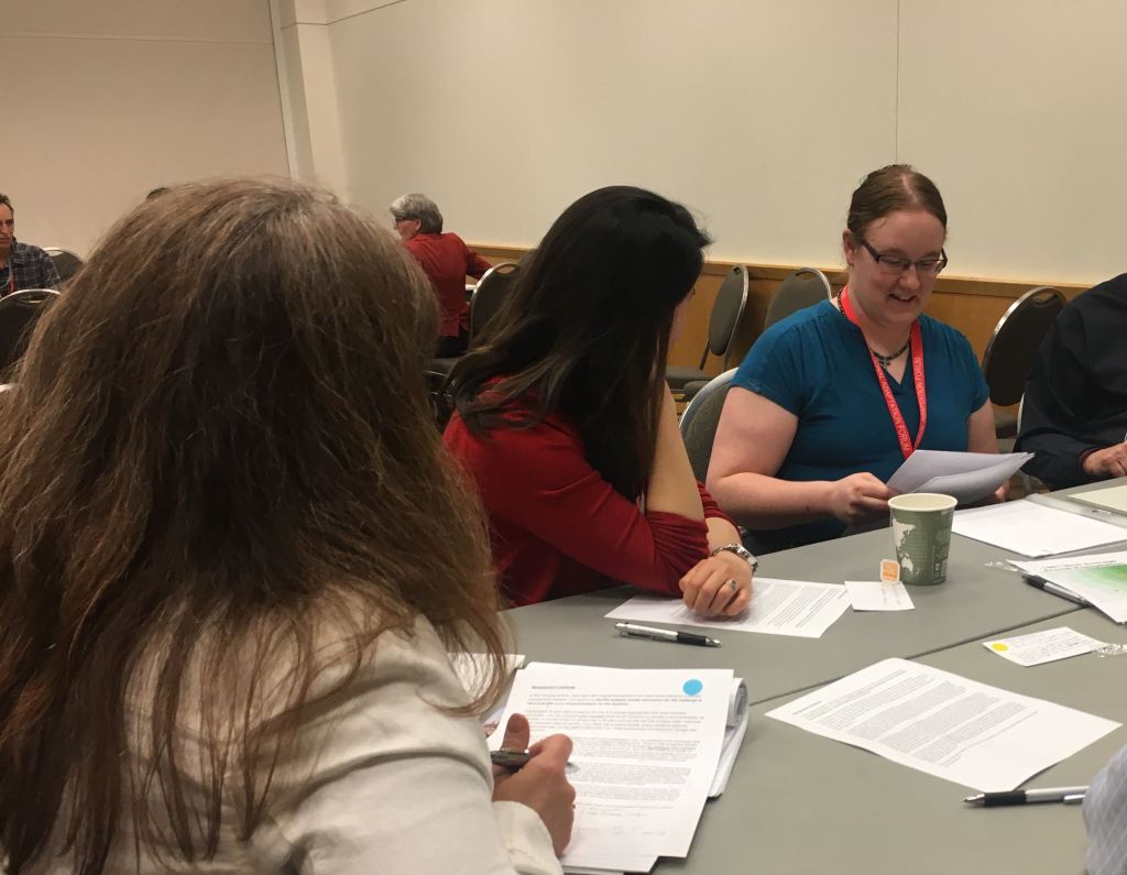 To prepare participants for the activity, we started with a brief, non-technical presentation on climate model projections. We focused in particular on two things: how the projections are built and their primary limitations; and, how climate scientists help translate model data for practical uses. The heart of the NAF session was an interactive activity in which small groups worked through a real world decision problem that involved the use of climate projections. Participants were given a few paragraphs describing a hypothetical decision problem in which a governor was unsure whether or not to sign a 50-year contract to sell water to another city. They were asked to provide the governor with a recommendation about which action to take: sign the contract, or not? The facilitators in each group were climate scientists with experience using the projections, and they were accompanied by note-takers to document the conversations at each table. Each small group worked through a process together to make the decision using the projections. For this activity, the process the participants used and the relationships they developed with the facilitators were considered the most important part to capture.