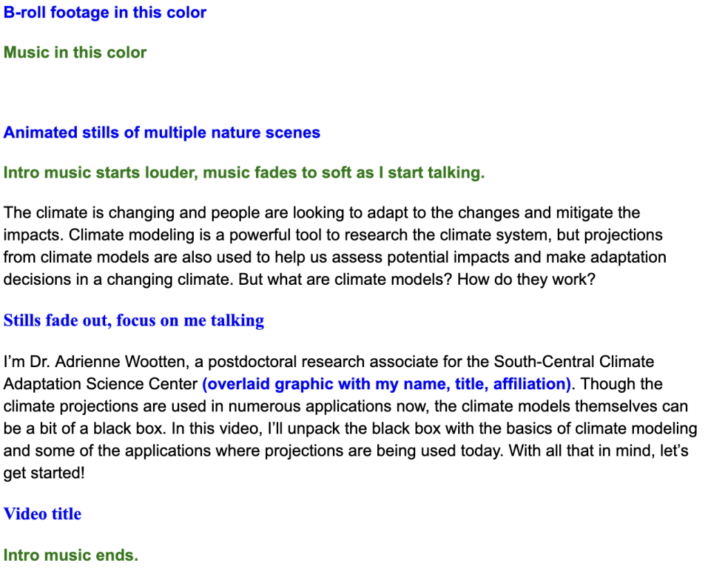 Let’s face it, the current pandemic has changed a lot for how most scientists work. We’re teleworking more than before, doing webinars, and having virtual meetings in place of in-person meetings. One thing I do frequently is climate modeling 101 presentations and webinars. Back in June, I was asked by colleagues at the Southeast Climate Adaptation Science Center (SECASC) to do one such presentation for the Climate Adaptation Resilience Immersion Meeting in August. This time, there was an opportunity to do something different. I could give a webinar, or I could record a video. Although I’d never done it before, I chose to record a video for a climate modeling 101. I chose to do a video for a couple reasons. First, to learn a new way to communicate my own work or climate science generally. Second, climate 101 presentations tend to be informative, but not engaging. This was an opportunity to try a new approach to a climate modeling 101 video that is both informative and engaging, reaching new audiences.