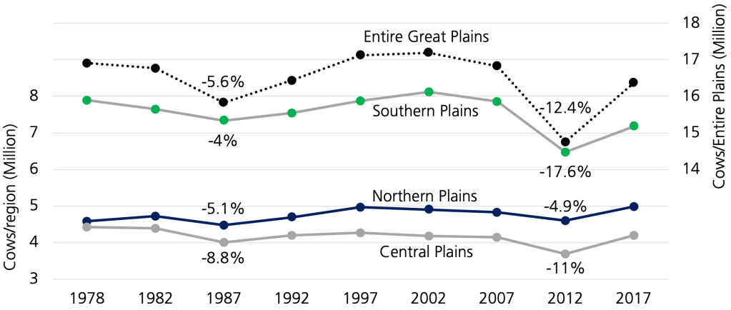 The U.S. Great Plains, the vast agricultural flatlands between the Mississippi River and the Rocky Mountains, are renowned for producing most of the country’s corn, wheat, and soybeans. But they are also home to 16 million beef cows, half of the U.S. beef herd. Ranching is part of the identity of the Great Plains. Livestock plays a key role in maintaining healthy grassland ecosystems, allowing them to reduce soil erosion, store atmospheric carbon in their massive root systems, and provide natural habitats for birds and butterflies migrating across the Great Plains every year. Ranching is also a major economic player in the Great Plains, producing $40 – 50 billion in annual revenue, sustaining many rural communities.