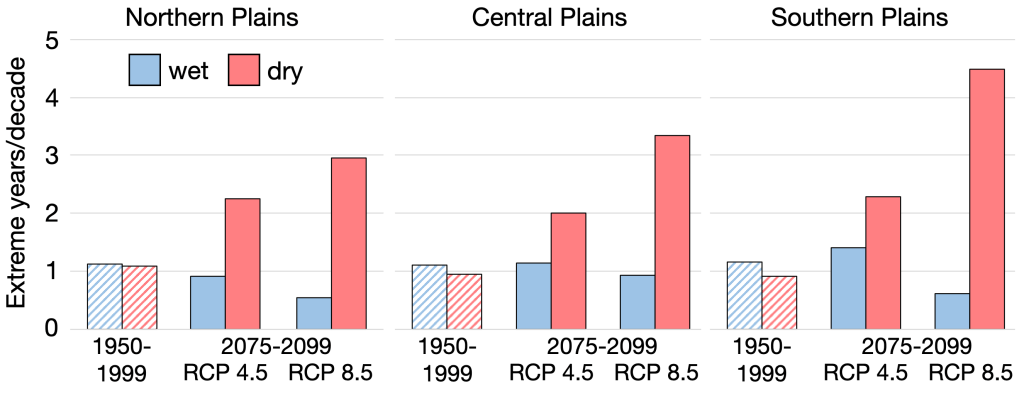 In addition to these gradual changes, the swinging pendulum of climate variability will bring more years with extreme droughts and fewer years with wet growing seasons, our preliminary research shows. In the past, extremely dry years like those in the 1950s and 1980s have occurred about once per decade and were balanced by one extremely wet year. By the end of this century, dry years will outnumber wet years by a ratio of around 2/1 and 4/1 for moderate and extreme warming. Adding to this imbalance, dry years will also become drier while wet years will become more moderate, and conditions will swing more violently from wet to dry compared to today (as they already do compared to the first half of the 20th century).