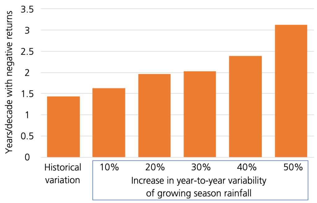 As a result, the economics do not look good. Breaking even or turning a profit will become more and more difficult because preparing and responding to droughts will become more difficult and more expensive for ranch operations. We ran an economic model and estimate that under historic rainfall variability, an average-size ranch in the Central Plains (100 – 200 animals) will have negative returns (i.e., lose money) in one out of seven years. Under extreme climate change (with rainfall variability growing by 26%), the same ranch will lose money every five years by the end of the century. In the Southern Plains, where rainfall is projected to vary by 52%, the situation will be even worse. One in three years will have losses, leaving ranchers with only two years to make up for it. What is more, herds will become 20 to 40% smaller to stay manageable, leaving ranchers with fewer animals to support their income.