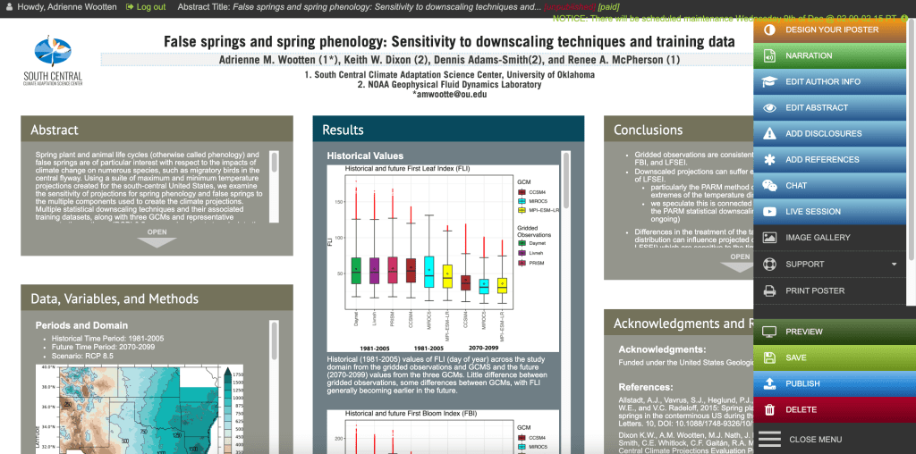 iPoster, a system to create and present research posters virtually, is a useful system used by AGU. While your poster appears like a poster, you are not restricted by a 3-foot by 4-foot space. You can include as much content in your virtual poster as you choose (including videos, photos, and links to relevant resources and references). You have unlimited creativity as you build your virtual poster. But that isn’t entirely a good thing because you can cram in material and inadvertently make your poster longer then the audience will be willing to read (I’ve encountered a few of those already). So, the space limitation of an actual poster can be quite helpful to condense your message to your key points. Besides, I found the iPoster editor interface to be quite a user un-friendly compared to the tools I would normally use to prepare a poster. There is quite a learning curve to producing a virtual poster when the interface is not what you are used to.