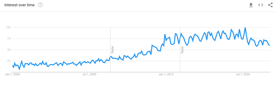 Perhaps because of these benefits, mindfulness has been adopted into many groups, including corporate life – for better or, maybe, for worse. “The mindfulness conspiracy,” an article in The Guardian in 2019, talked about the “evangelical” nature of the $4 billion mindfulness movement. Mindfulness-Based Stress Reduction (MSBR) is a largely Westernized version of certain meditative practices, sold to corporations as a way to maximize profit by ensuring that their employees are performing well. The mindfulness movement has spun out into other organizations, too, like universities. Demonstrating this popularity in the mainstream, Google searches for the term “mindfulness” grew in popularity in recent years and continue to remain relatively high. Mindfulness has certainly been popularized, at least in some circles.