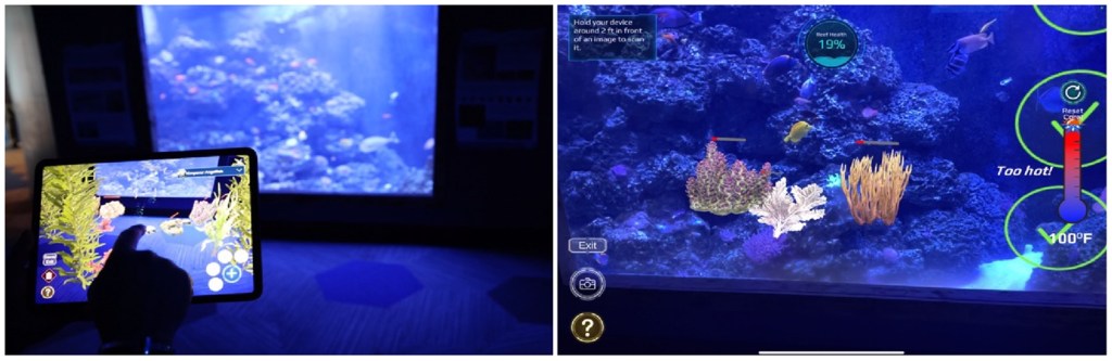 Fun-filled locations like zoos and aquariums are great opportunities to get kids excited about science, so we chose Blue Zoo aquariums to deploy our first educational AR application. Our preliminary results show that high school students generally like AR technology as a learning tool for coral reef ecology. They see it as an effective way to increase motivation and complement learning in both formal and informal education environments, while slightly favoring AR for formal classrooms. Significant improvements in knowledge assessment scores for all participants further support ARโs efficacy as a learning tool to increase understanding of coral reef ecology, while negating subject attitude effects on learning achievement that existed before our activity. However, we found that those learning outcomes may be moderated by gender identity.